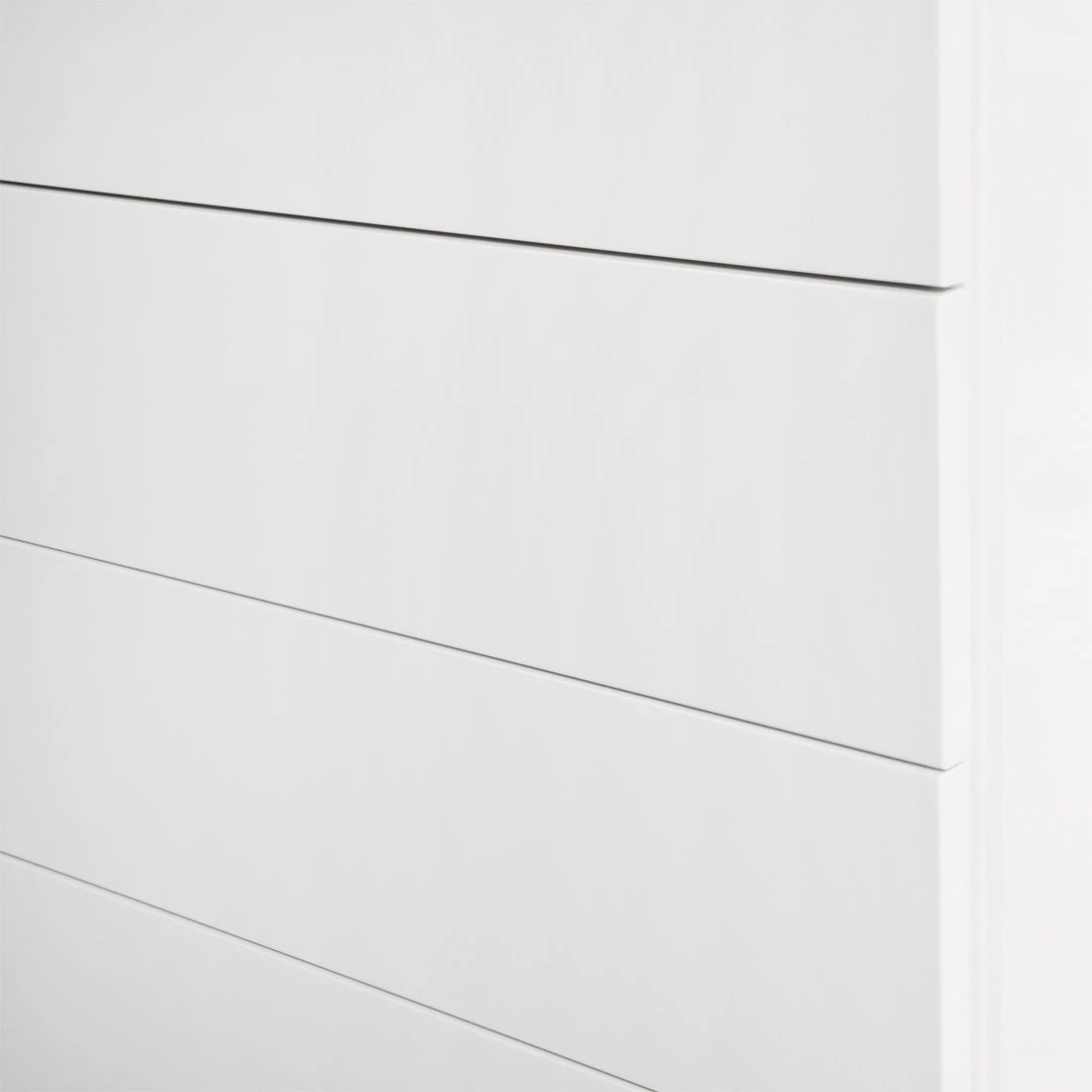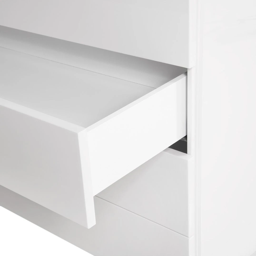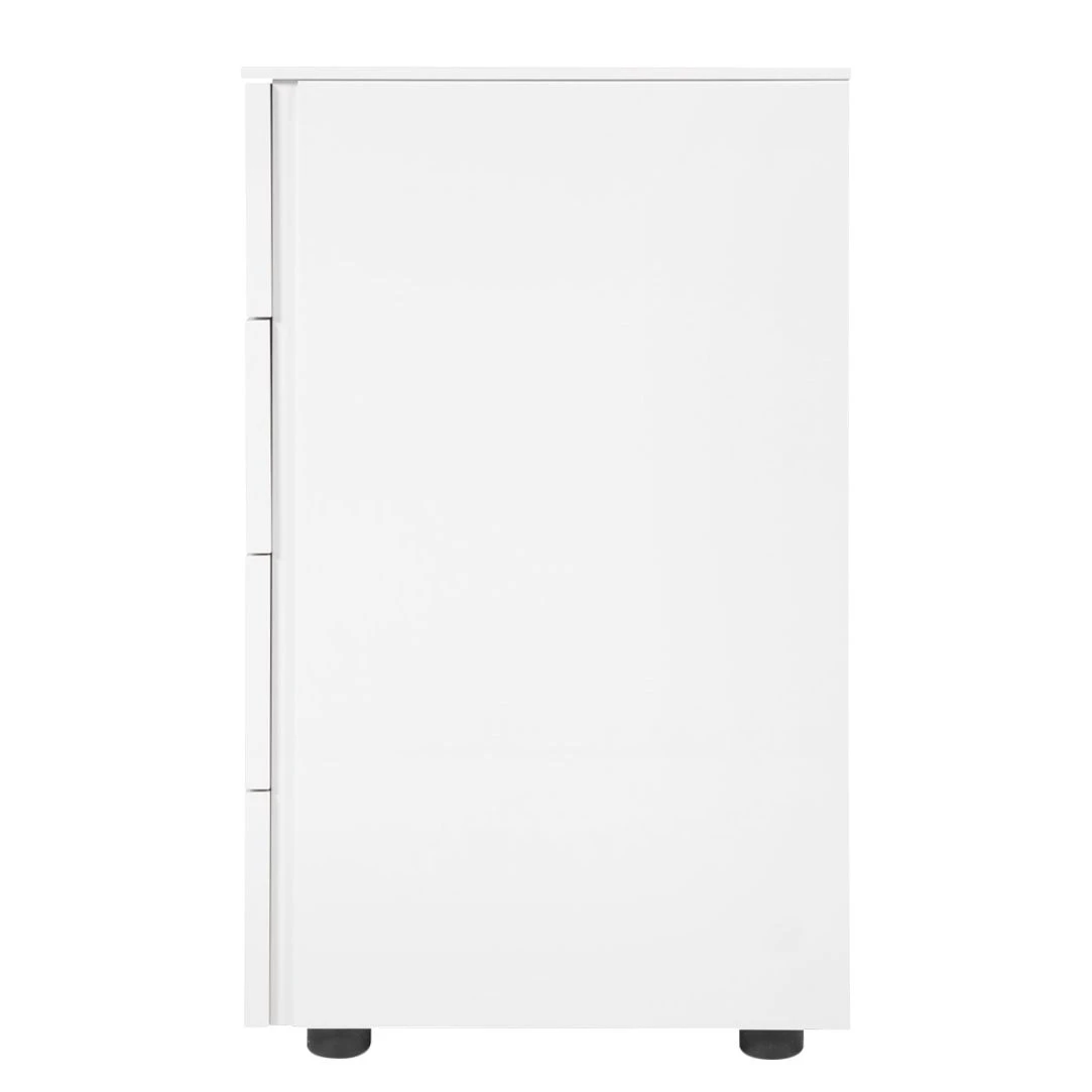 Die elegante Kommode Bianco II schafft in Wohn- und Schlafräumen sowie in Dielen eine moderne und angenehme Wohnatmosphäre. Hochglänzend weiß lackiert passt sich der Schrank bestens einer zeitlosen und stilvollen Einrichtung an. Mit zurückgesetzten Füßen wirkt das Sideboard, als würde es über dem Boden schweben. Vier große Schubladen ohne Griff geben der praktischen Kommode Bianco II viel Stauraum für Bettwäsche, Kleidung und andere Dinge. Durch die vielseitigen Einsatzmöglichkeiten ist der Schrank ein echtes Highlight für jedes Heim.