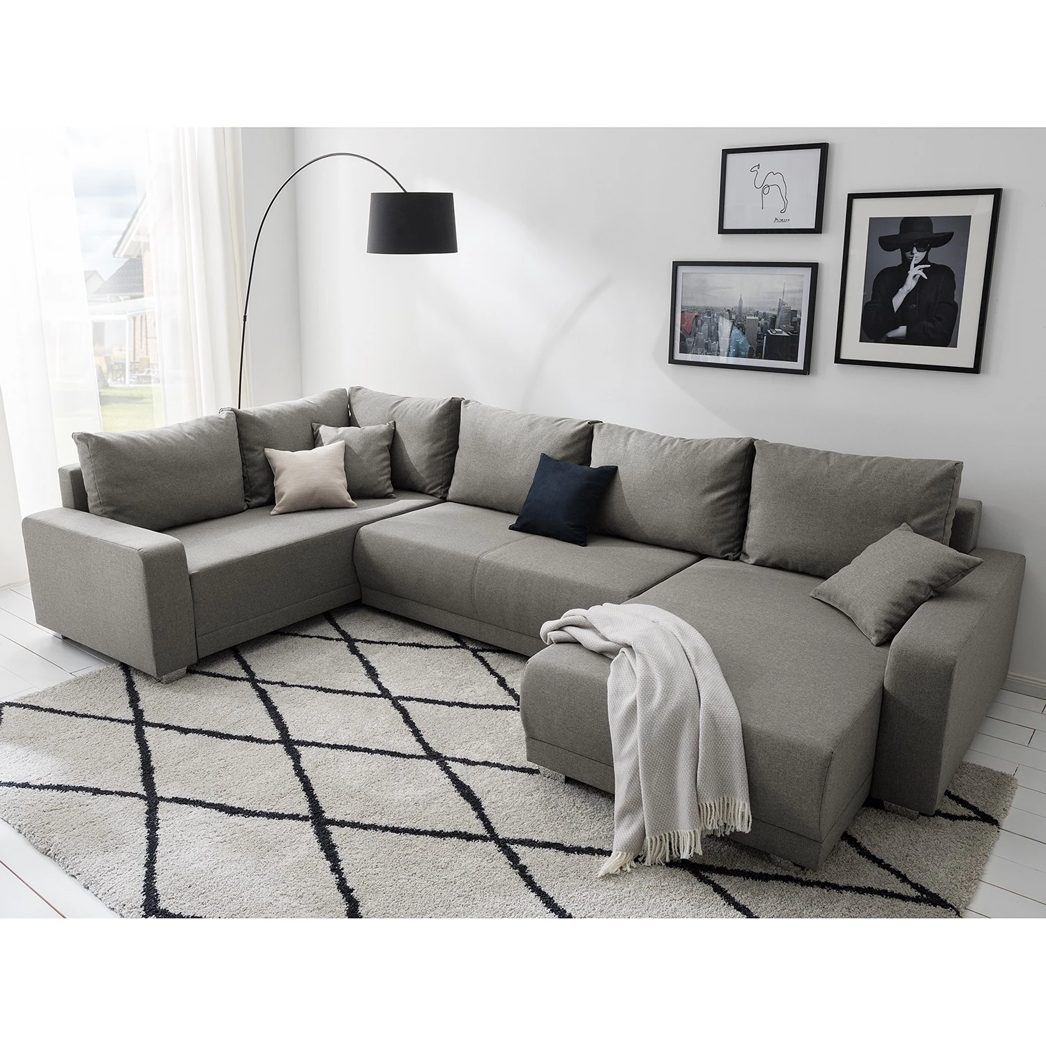 - Lieferumfang: Wohnlandschaft inkl. 6 Rücken- und 2 Zierkissen, ohne Dekoration