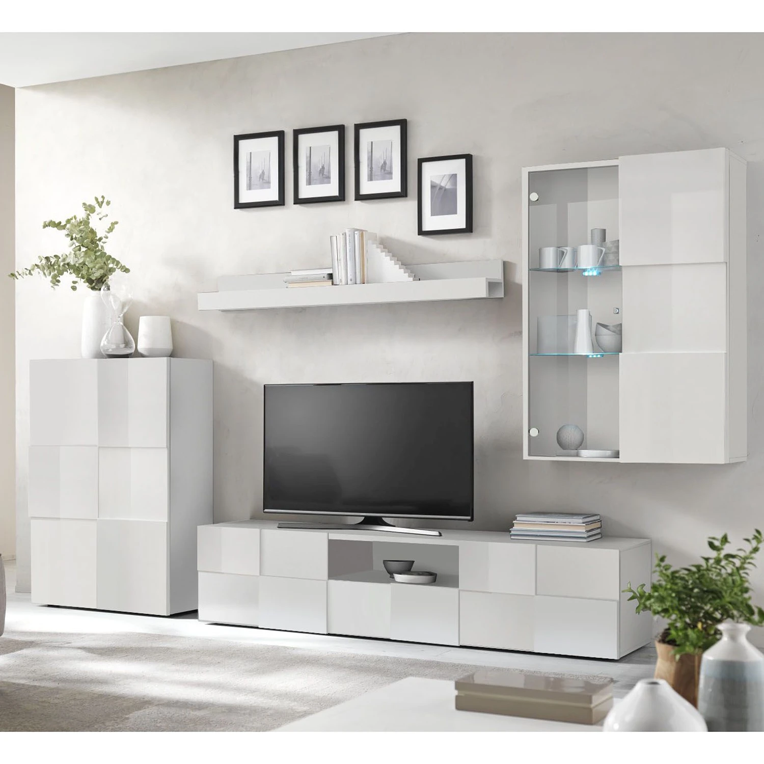 - Lieferumfang: Wohnwand bestehend aus 1 Kommode, 1 Wandboard, 1 TV-Lowboard & 1 Hängevitrine ohne Beleuchtung & Dekoration
