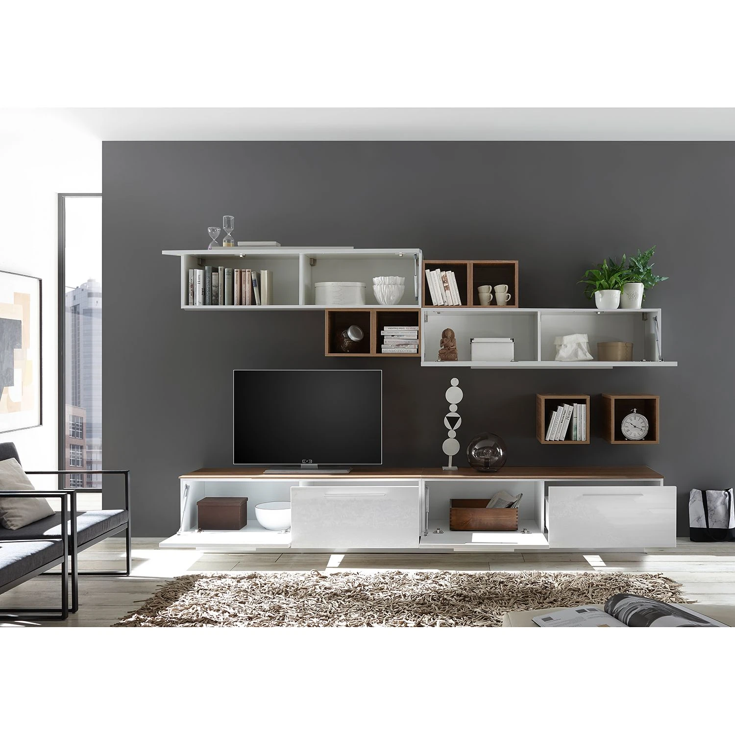 - Lieferumfang: Wohnwand bestehend aus 2 TV-Lowboards mit Klappe & Schubkasten, 2 Tops für TV-Lowboards, 2 Hängeelemente mit Klappe & 6 Wandregalen
