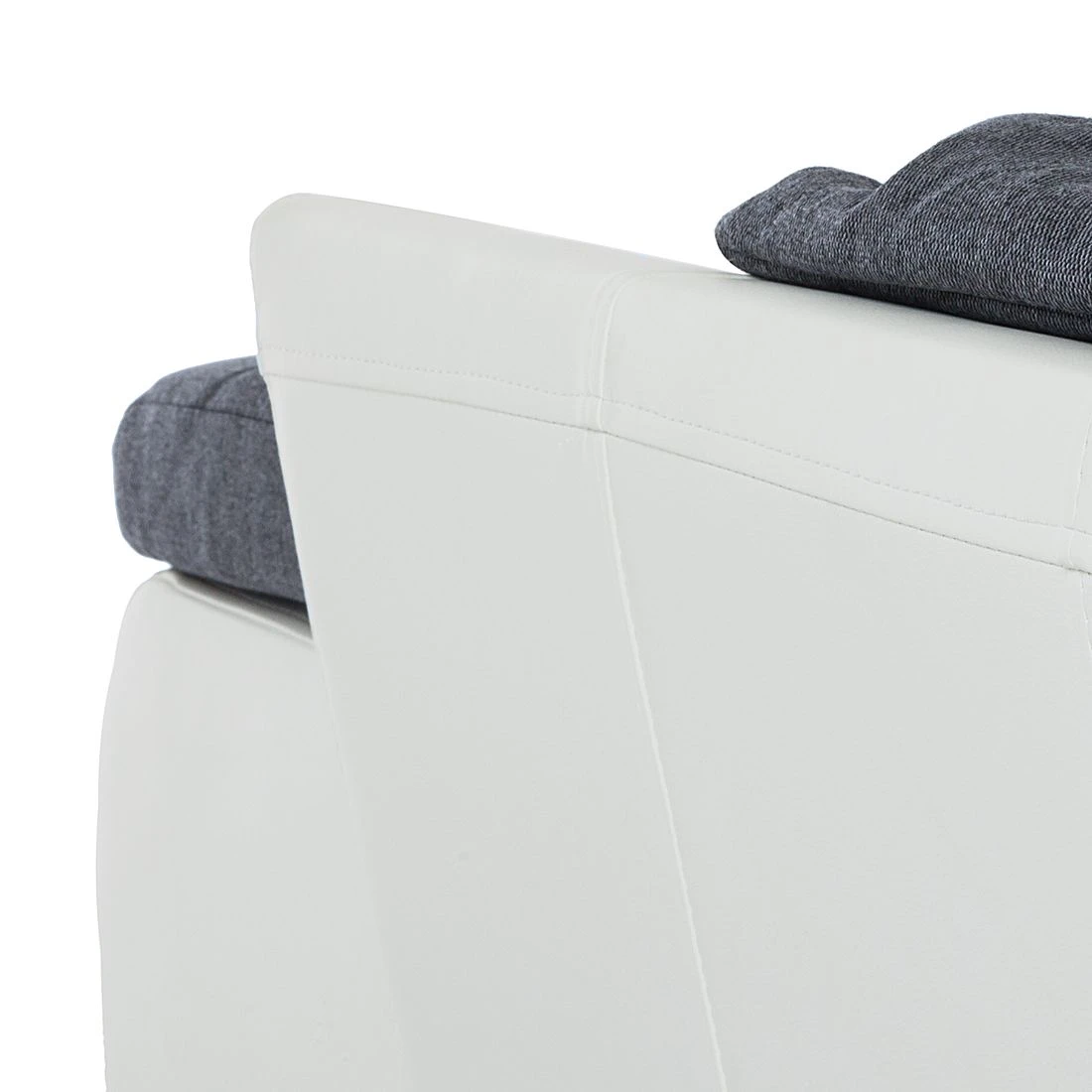 Das 275x80x178 cm große Ecksofa Huelva von mooved besteht aus einem 3-Sitzer-Sofaelement und einem Longchair, der sich auf der rechten Seite befindet. Als Basis dient ein stabiles Holzgrundgestell, das rundum mit einem weichen Kunstleder Weiß mit feiner Ledermaserung bezogen ist. So hast Du die Möglichkeit, Dein Sofa frei im Raum aufzustellen. Für die Polsterung der Sitzflächen kommt ein Polyetherschaum auf Wellenunterfederung zum Einsatz, der mit einem fein strukturierten Webstoff in Grau bezogen ist. Deinen Rücken stützen drei Rückenkissen mit Polyetherschaum-Füllung und Webstoffbezug im Farbton der Sitzflächen.