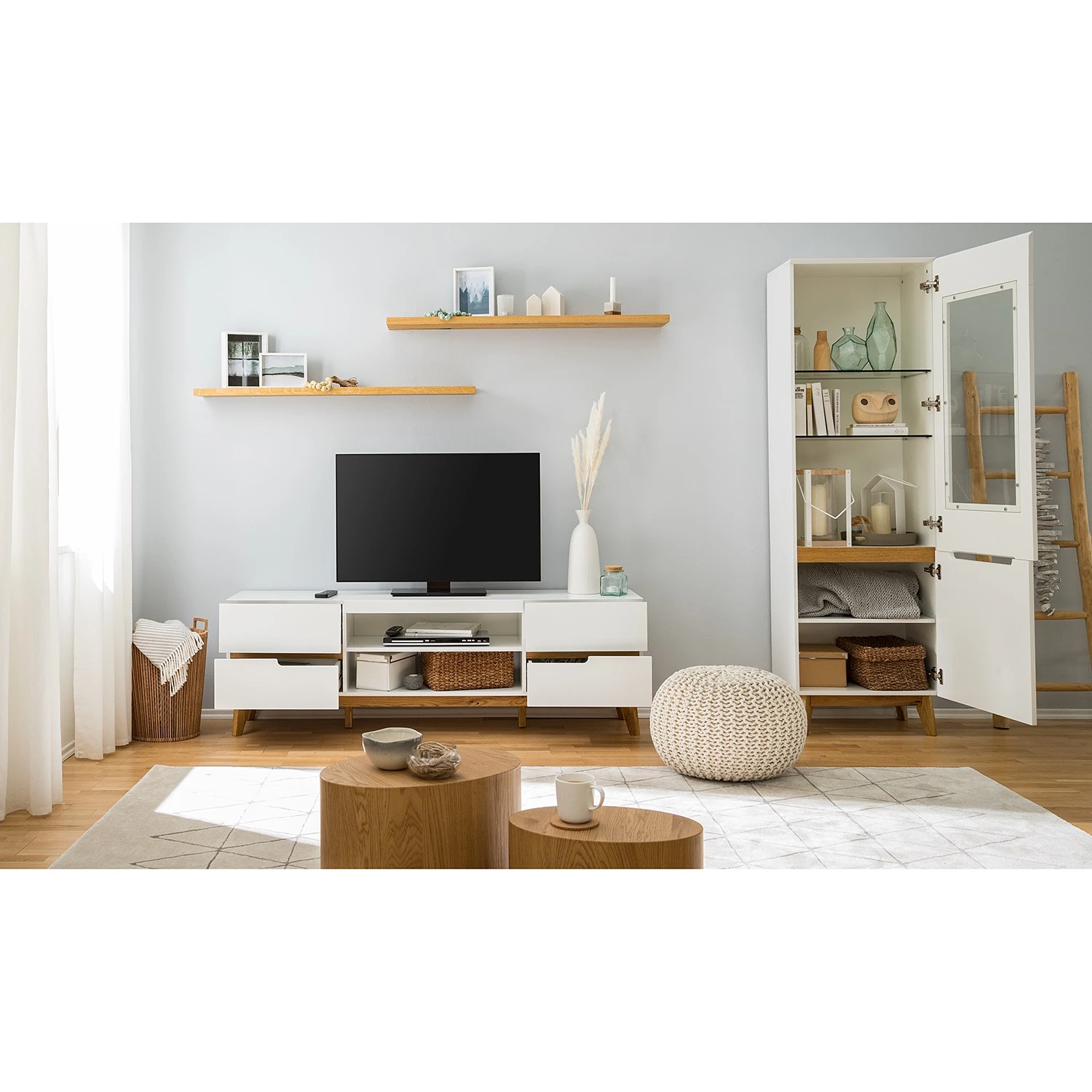 - Lieferumfang: 1 TV-Lowboard, 2 Wandboards & 1 Standvitrine ohne Beleuchtung & Dekoration
