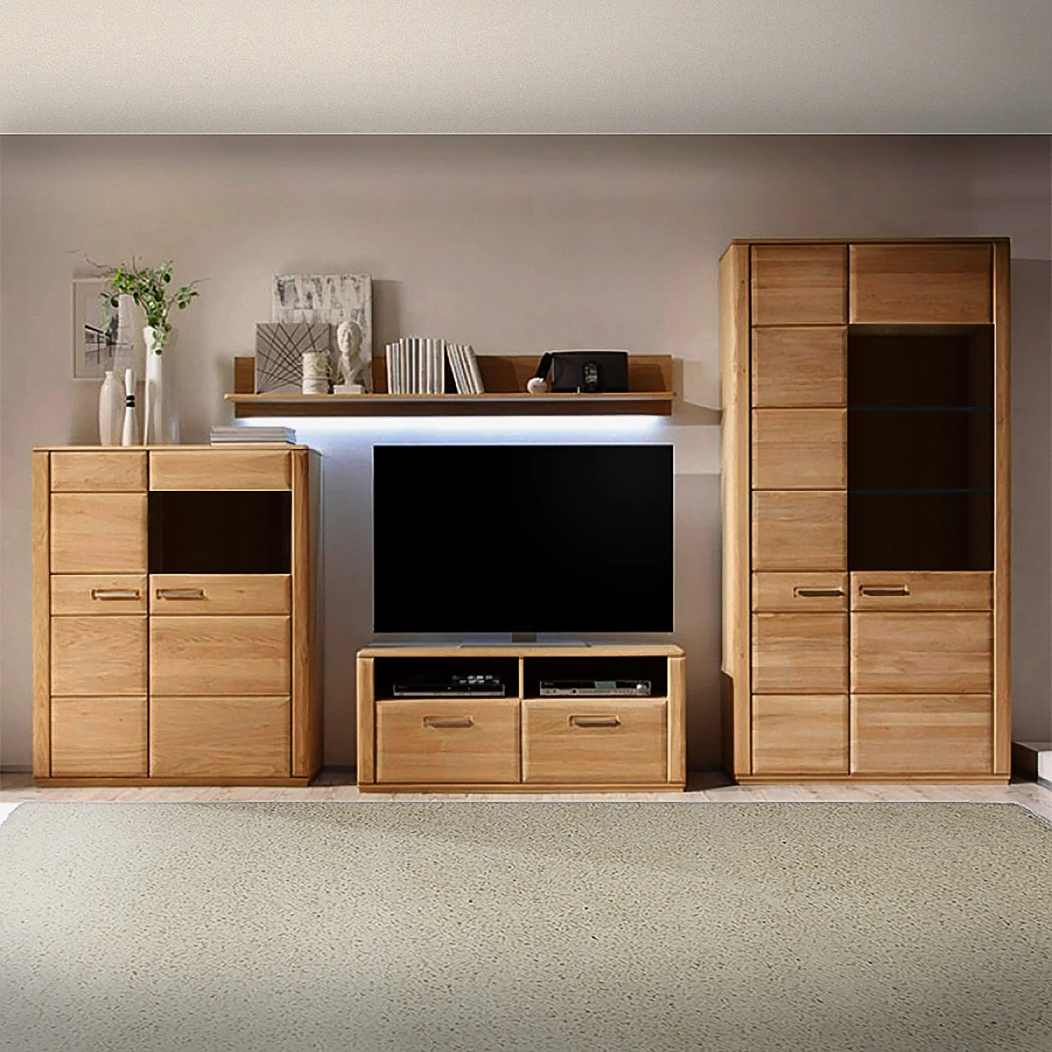 - Vitrinenschrank, TV-Lowboard & Highboard werden montiert geliefert