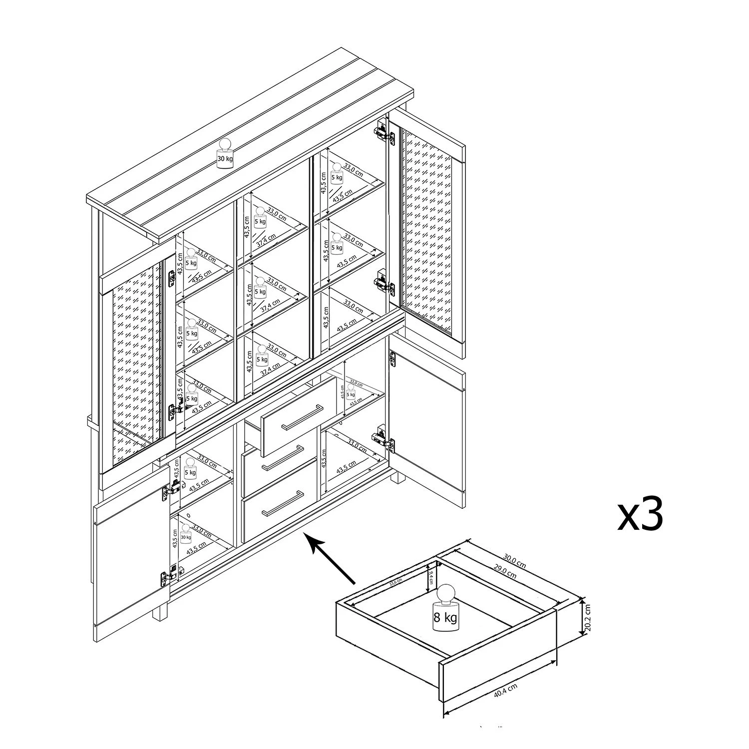 • Innenmaße Schubladen: BHT: 33.6 x 9.4 x 29 cm