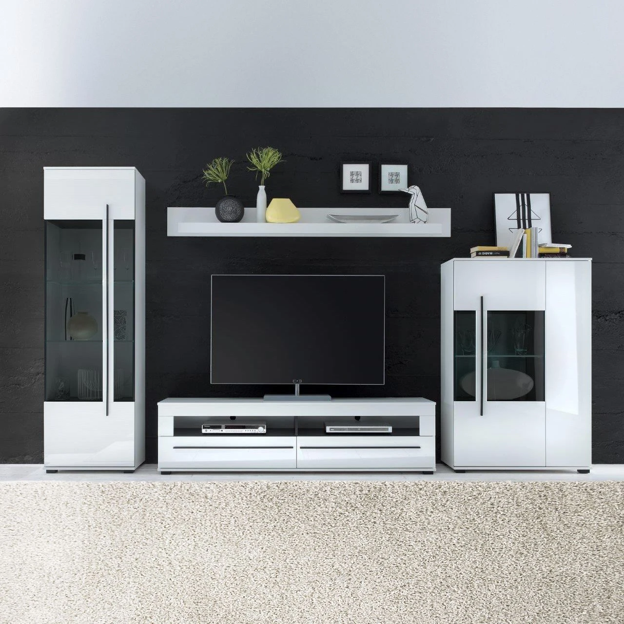 Mit einer klaren Formensprache und im eleganten Hochglanzdesign präsentiert sich die 4-teilige Wohnwand Farson, die für ein modern eingerichtetes Wohnzimmer wie geschaffen ist. Robuste MDF Platten, die foliert wurden, sowie edles Grauglas bilden die Front, während der Korpus aus folierter Spanplatte gefertigt wurde. Die 4-teilige Wohnwand Farson besteht aus einem Wandboard, einer Standvitrine, einem Highboard sowie einem Lowboard als TV-Möbel. Die langen Griffleisten unterstreichen die elegante Optik zusätzlich und geben der Wohnwand Farson ein attraktives Äußeres.