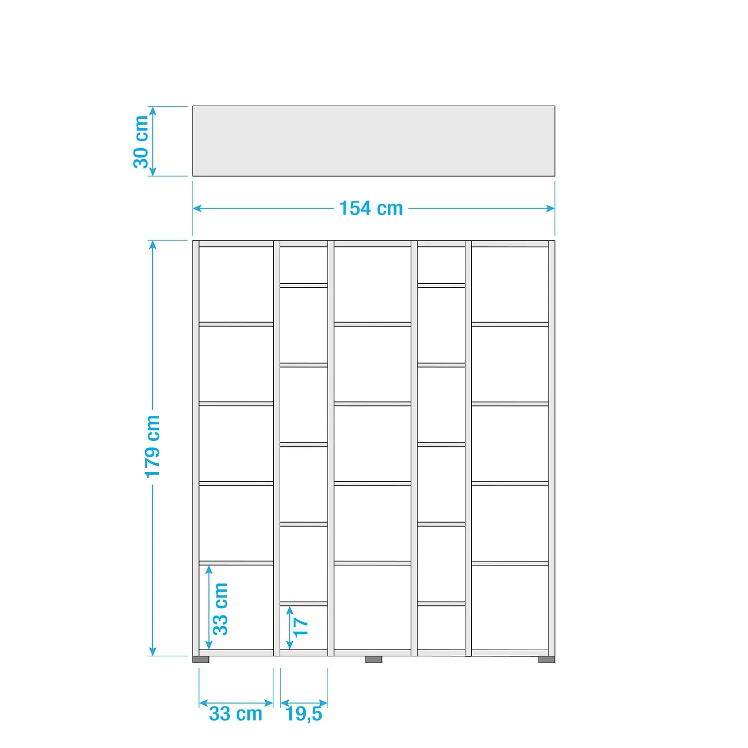 - Kleine Fächer: je 19,5 x 17 x 19,5 cm
