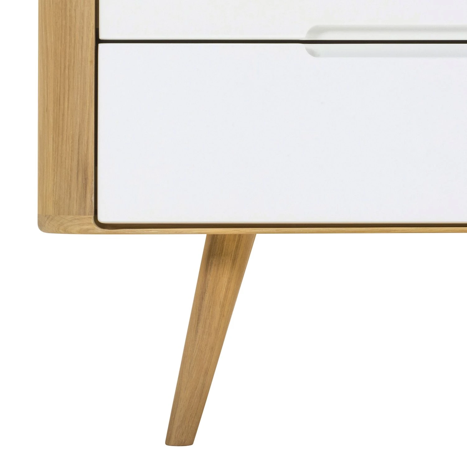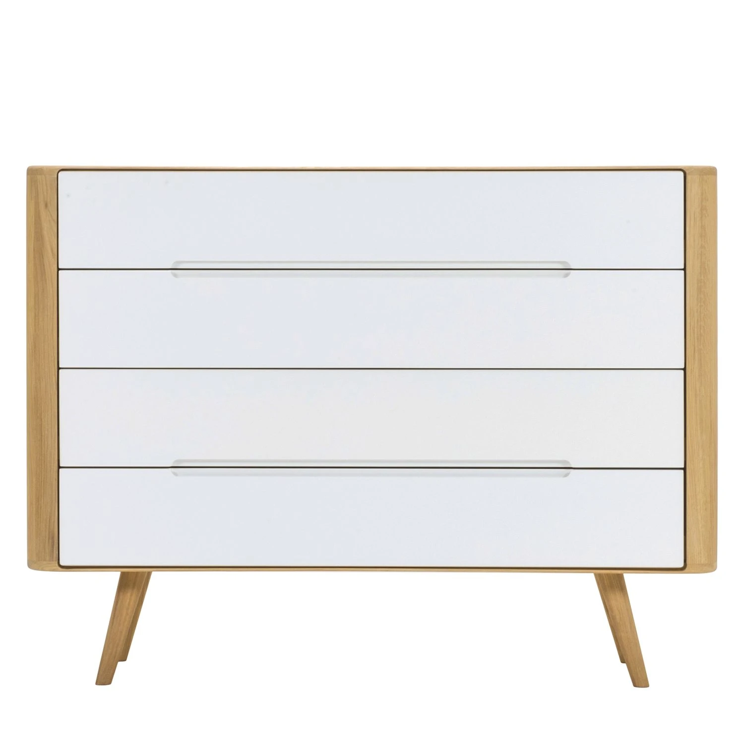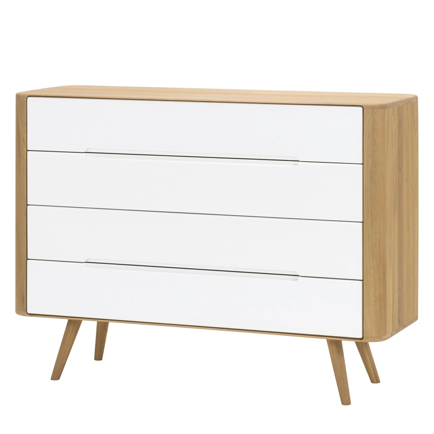 Vom Stil der 1960er-Jahre inspiriert hat der Designer Salih Teskeredžic diese Kommode Loca II entworfen, die vor allem aufgrund ihrer Geradlinigkeit und hochwertigen Materialien ins Auge fällt. Der Korpus und die leicht schräg gestellten Beine sind aus massiver Wildeiche gefertigt. Das Holz wurde geölt, sodass seine ganz eigene Maserung perfekt zur Geltung kommt. Die Front aus lackierter MDF-Platte setzt farblich einen schönen Kontrast dazu. Durch die sanft abgerundeten Kanten wird der stilvolle Entwurf des Möbels perfekt unterstrichen. Auch durch die minimalen länglichen Griffmulden der vier Schubladen, die mit einer praktischen Soft-Close-Funktion ausgestattet sind, kommt die geschmackvolle Gestaltung der Kommode Loca II zum Ausdruck.