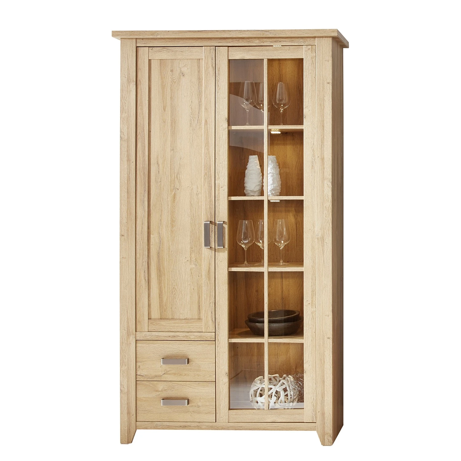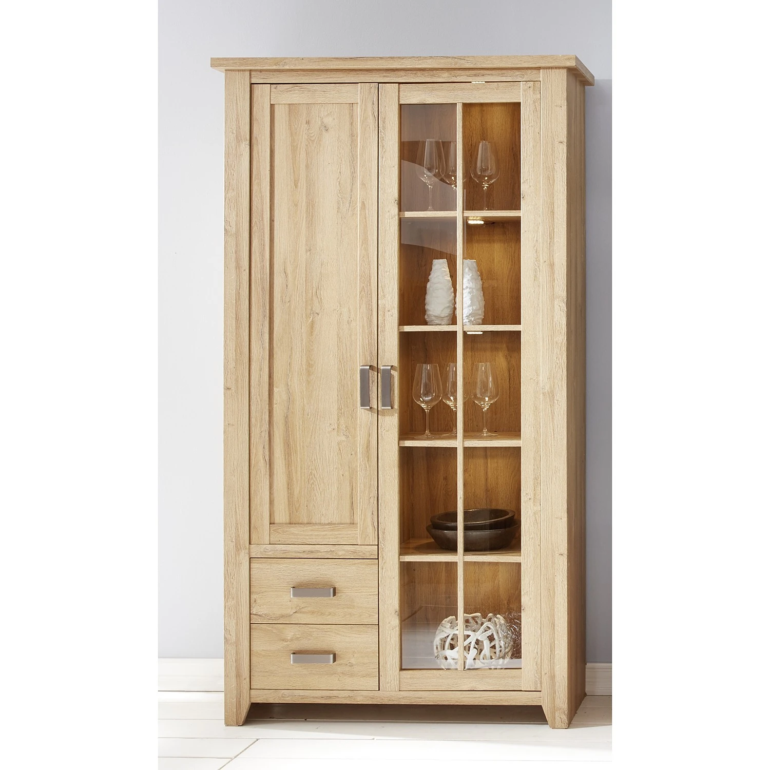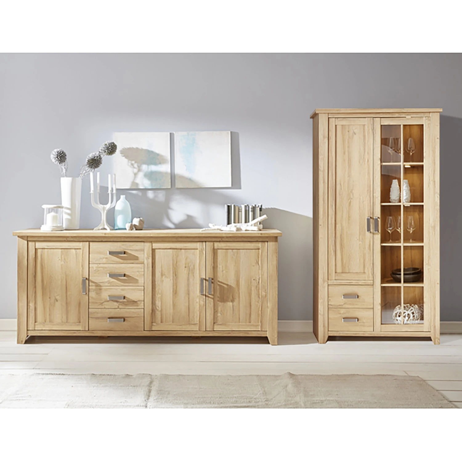 - Lieferumfang: Wohnkombination bestehend aus 1 Sideboard & 1 Vitrinenschrank ohne Beleuchtung & Dekoration